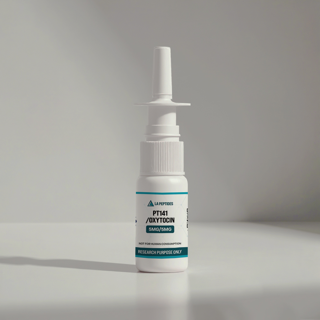 PT-141 and Oxytocin are provided in a dual-compound spray format for research involving peptide classification, receptor interaction, and formulation analysis. Each unit contains 5 mg of each compound. This product is intended strictly for laboratory research use only and is not for human or veterinary use.
