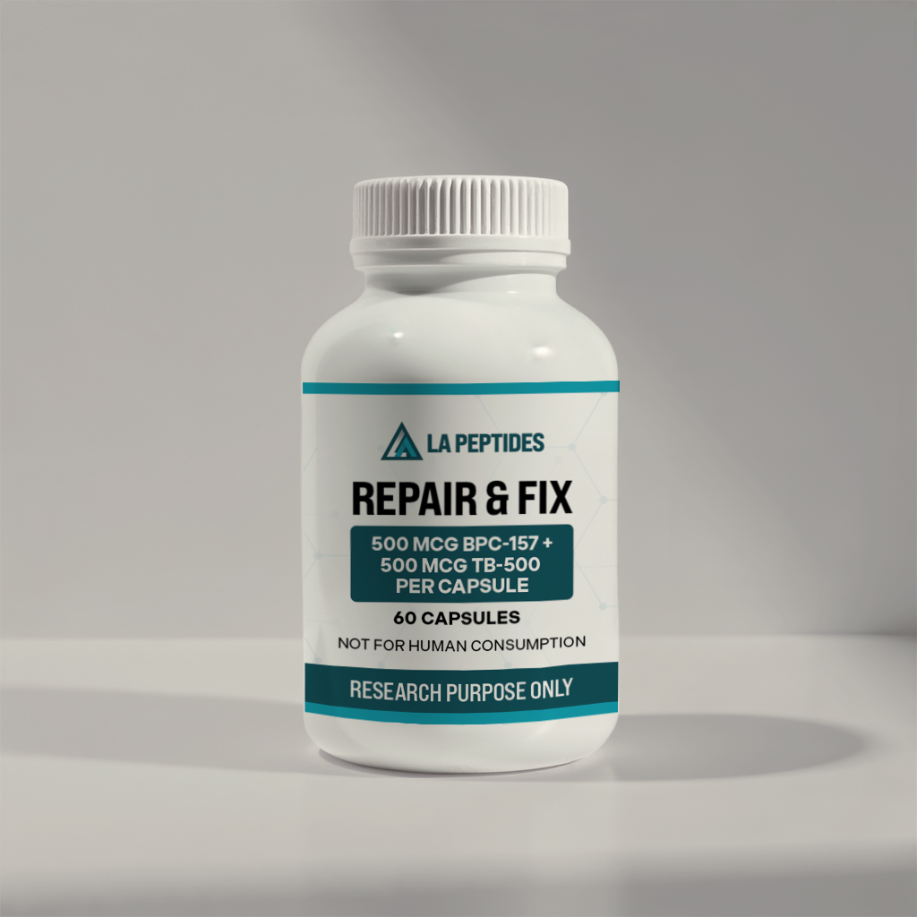 Repair & Fix capsules contain 500 mcg of BPC-157 and 500 mcg of TB-500 per capsule. Designed for controlled laboratory research, this peptide combination is studied for its role in cellular repair processes, tissue modeling, and cytoskeletal dynamics. Each batch is prepared with high-purity lyophilized peptides for research use only.